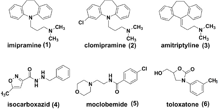MAOIs (monoamine oxidase inhibitors, e.g., isocar-boxazid (4) ,[13-15] moclobemide (5) ,[16-18] and toloxatone (6) [19]) represent another category of anti-depressants [20, 21]. These agents inhibit the activities of monoamine oxidases, which are responsible for oxidation and inactivation of monoamine neurotransmitters (e.g., serotonin, dopamine and norepinephrine). The potential interaction between MAOIs and tyramine enriched food might lead to severe or fatal hypertension [22, 23]. Moreover, since monoamine oxidases bear similar structures and functions to cytochrome P450 enzymes, most MAOs were also identified as drug metabolizing enzymes and could induce potential drug-drug interactions. Today, MAOIs have been indicated for the treatment of depression when other treatments failed to work [24].