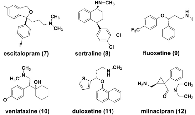The availability of selective serotonin reuptake inhibitors (SSRIs) in 1980s changed the management of MDD significantly[25]. Citalopram [26, 27] (as well as the Senantiomer escitalopram (7) , [28-30]) sertraline (8) [31-33] and fluoxetine (9) [34] have become the most prescribed antidepressants in many countries. SSRIs are effective, more tolerable and safer over TCAs or MAOIs. Introduction of a norepinephrine component yielded serotonin norepinephrine reuptake inhibitors (SNRIs), such as venlafaxine (10), [35-37] duloxetine (11), [38, 39] milnacipran (12) [40, 41]. These agents are believed to deliver similar potent anti-depressant activities and also to be effective for the treatment of neuropathies [42, 43].