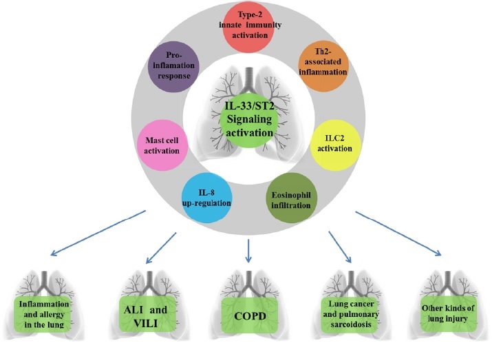Figure 2: IL-33/ST2 signaling participates in various types of lung injury. IL-33 /ST2 signaling activation followed by type-2 innate immunity activation, Th2-associated airway inflammation, group 2 innate lymphoid cell (ILC2) activation, eosinophil infiltration, IL-8 up-regulation, mast cell activation and pro-inflammation response, further participates in lung inflammation and allergy, acute lung injury (ALI) and ventilator-induced lung injury (VILI), chronic obstructive pulmonary disease (COPD), lung cancer and pulmonary sarcoidosis and other kinds of lung injury.