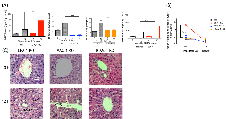 Figure 2: Liver injury and neutrophil recruitment following CLP surgery in LFA-1, Mac-1 and ICAM-1 KO mice (A) Myeloperoxidase activity levels of liver from WT, LFA-1, Mac-1 and ICAM-1 KO mice, WT with or without M17/4 antibody injection (n = 6-8 per group) at 0 and 12 hours after CLP surgery. Statistical analysis was performed using one-way ANOVA with Bonferroni post hoc analysis. *** denote p < 0.001, respectively; n.s. = not significant.; B) Peripheral blood neutrophil counts at 0 and 12 hours after CLP (n = 6 per group). Two-way ANOVA with Bonferroni post hoc analysis. ***denotes p < 0.001 vs. WT; (C) Liver histology at 0 and 12 hours after CLP surgery in LFA-1, Mac-1 and ICAM-1 KO mice. Representative images are shown. Vacuolation was shown in arrow.