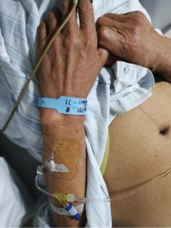 Since there is no identifiable or confidential information related to patient care, internal review board exemption is waived. Recently, our hospital received a male patient with lung cancer, lung cancer staging T3N1M1. The patient had left peripheral venous veins open at the dorsal aspect of the left forearm wrist during admission. Unusually, the indwelling catheter was punctured in the opposite direction from the traditional puncture (Figure 1).