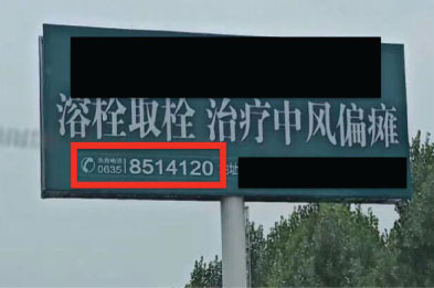 Figure 1: An advertisement for stroke management on the side of the highway. The portion outlined in red indicates the 11 digits of the emergency phone number. It is not an uncommon practice in China for many local hospitals to have their own specific emergency phone numbers, even though 120 as a standard specific medical emergency phone number has been implemented for many years.