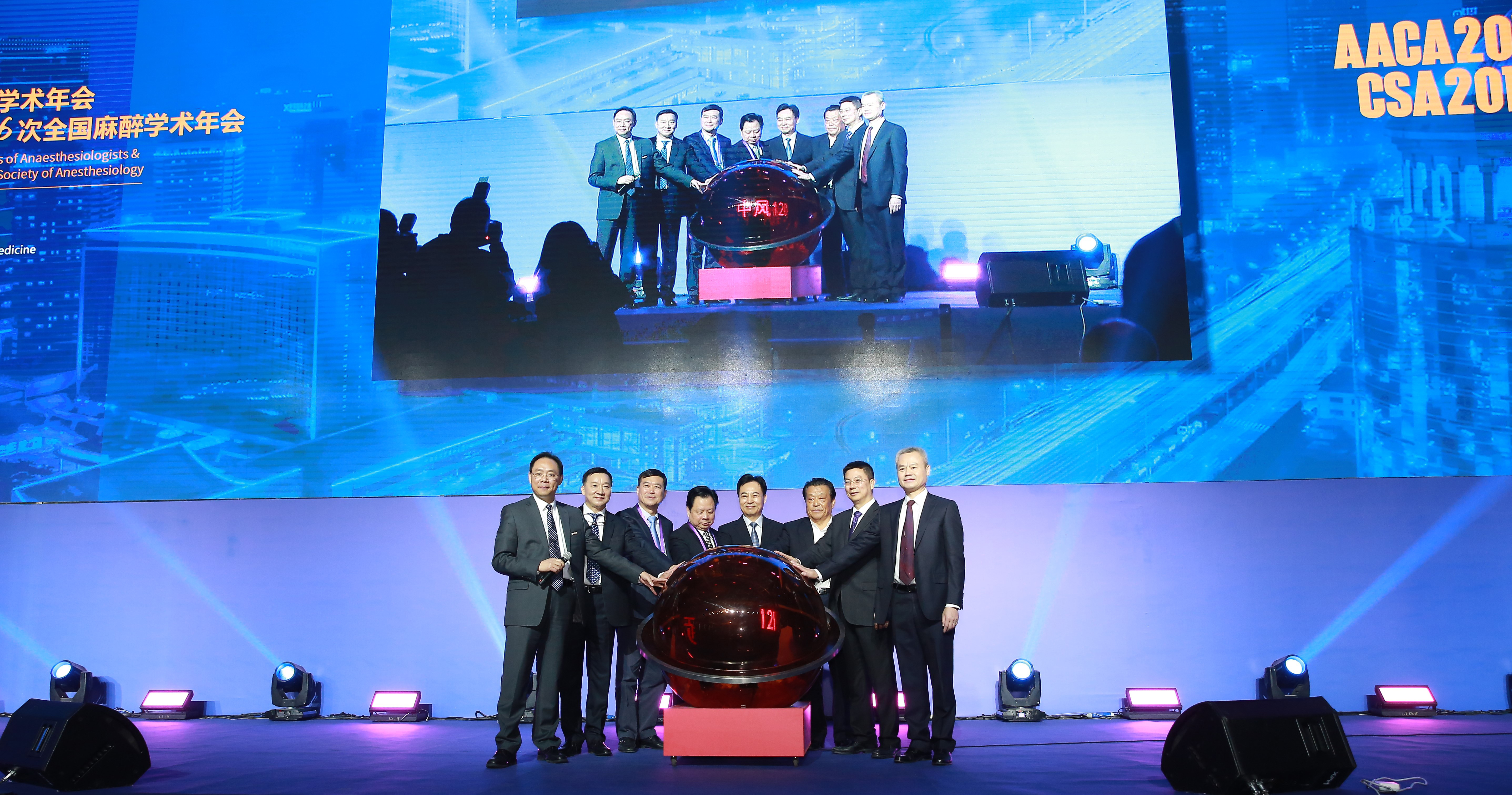 Figure 1: The video release at the opening ceremony of the annual meeting of the Chinese Society of Anesthesiology on Nov 1st, 2018. From left to right are Drs. Renyu Liu, Yuguang Huang, Jiahong Dong, Keqin Rao, Yupei Zhao, Xiaowei Ma, Lize Xiong, and Weidong Mi.