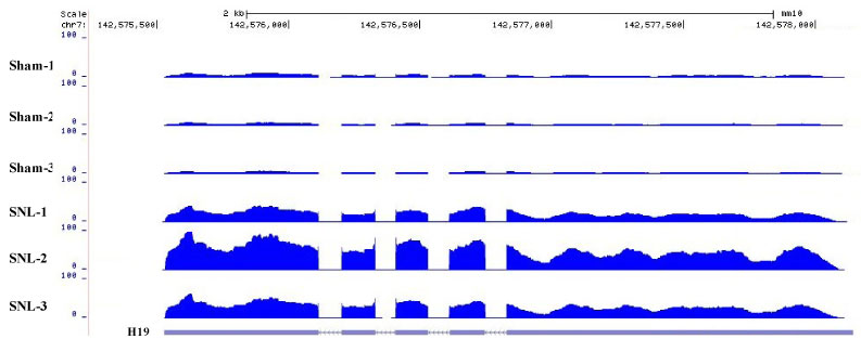 Figure 1: Visualized reads mapping to the genomic location of differentially expressed H19 gene. The stacked reads were increased in SNL samples significantly compared with sham samples in the genomic region of the H19 gene. N = 3 (30 mice) biological repeats/group.
