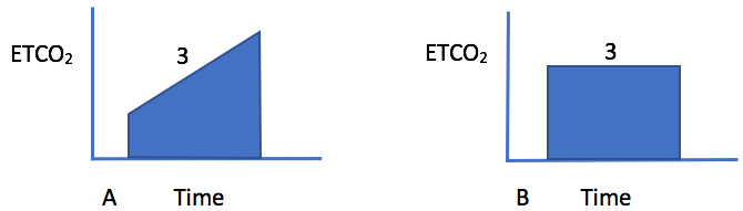 Figure 1: Representative capnograph trace during bronchospasm that demonstrates an upslope during phase 3 (A). In a normal lung, there is usually a plateau during phase 3 (B). The degree of upslope is proportional to the arterial to end-tidal PaCO2 gradient and the amount of ventilation-perfusion mismatch that is present.