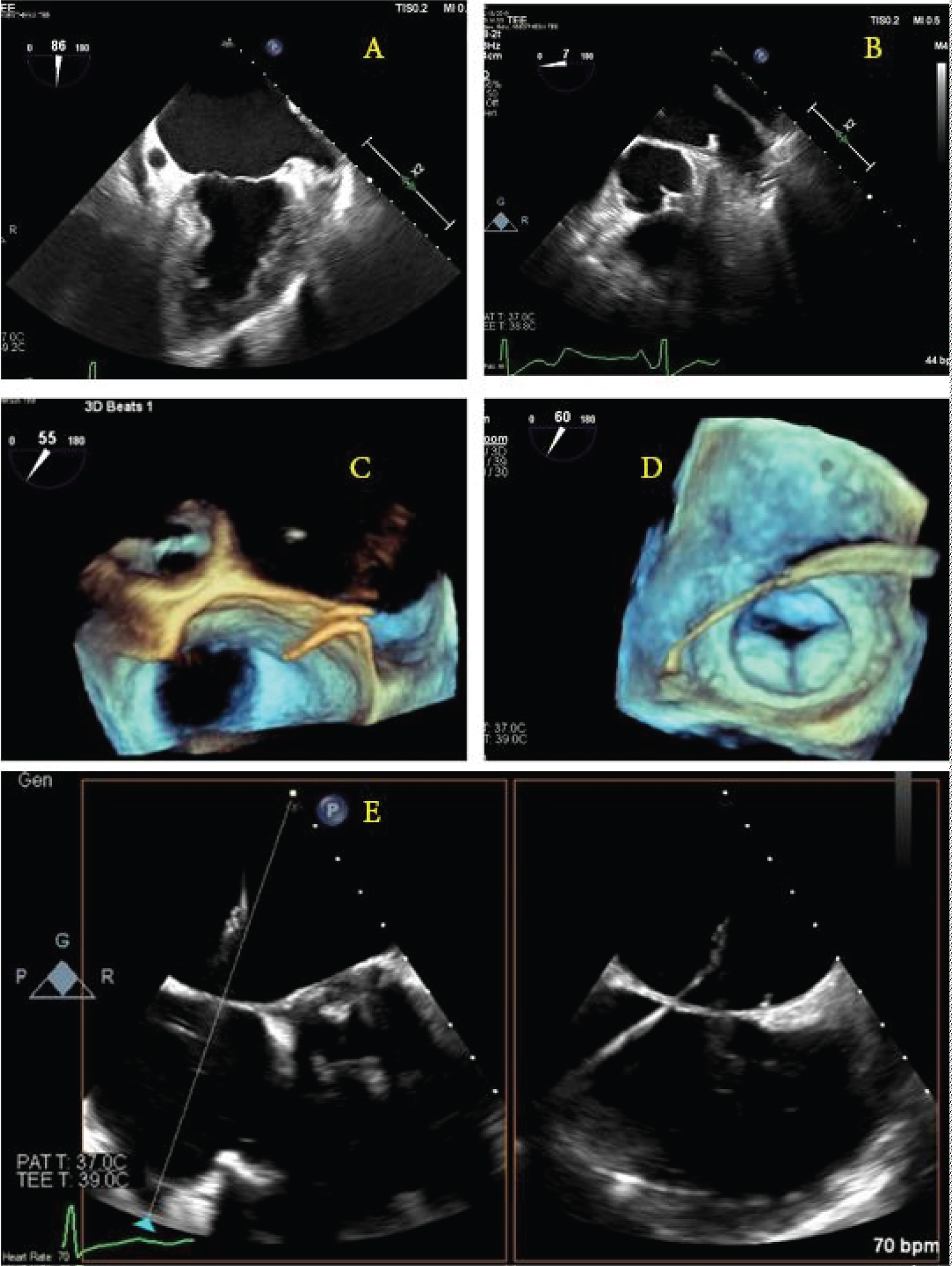 Figure 1: Schematic illustration of the guidewire punch location and direction under the direction of real-time transesophageal echocardiogram 2D/3D images. (a,b) The left atrial appendage as seen at 90° and 0°; (c) A 3D view of the wire coming across the interatrial septum; (d) A 3D image showing the wire crossing the left atrium and entering the left atrial appendage; (e) X-plane image-guidance of transseptal puncture.