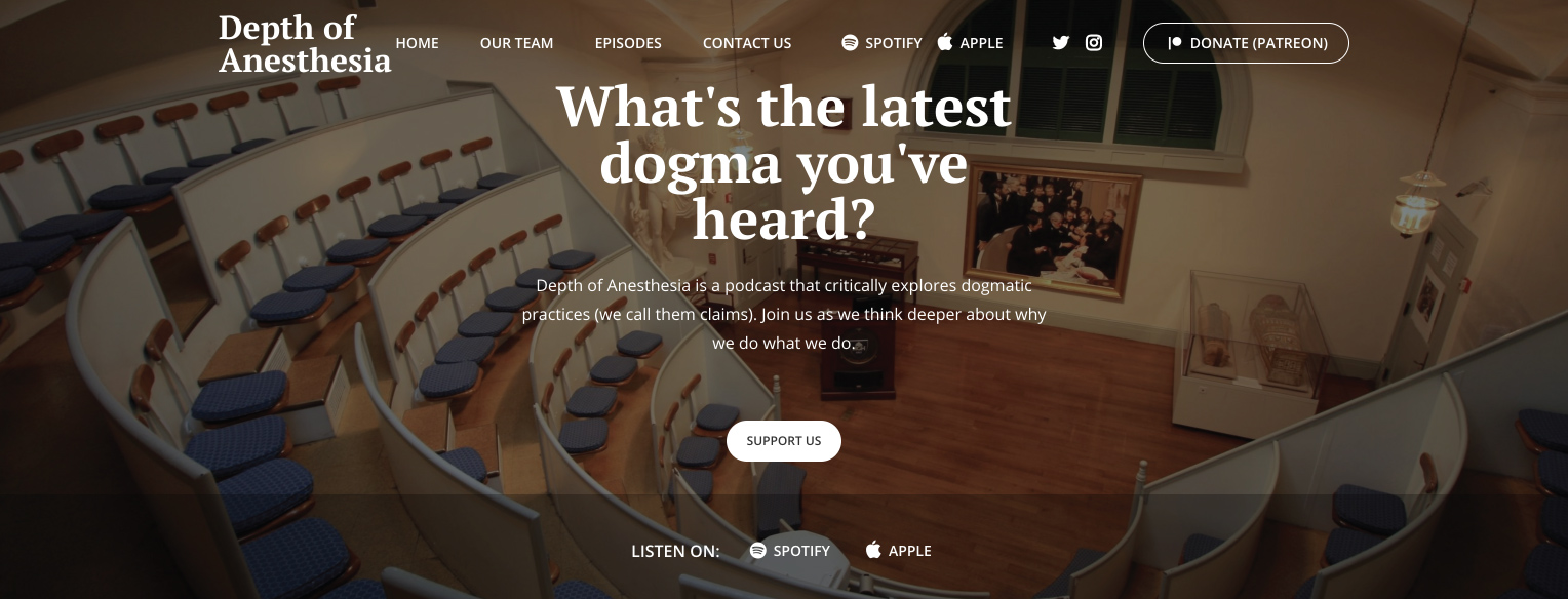 Throughout each episode of Depth of Anesthesia, the conversation between host and guests is designed to prompt the audience to consider questions related to the claims and re-examine their beliefs through the lens of the evidence presented. We foster additional engagement through social media (e.g., Twitter @depthanesthesia) to cultivate a community of clinicians who are interested in asking questions, staying up to date on literature, and engaging in lifelong learning to improve practice. As our podcast continues to grow, we hope to explore and study the role of podcasting in improving knowledge retention, shaping clinical practice, and informing on the latest literature. Our goal is to bring dialogue around the topics we explore on the podcast to operating rooms around the world and to inspire our audience to explore the evidence underlying our practices. All our podcasts are available at depthofanesthesia.com (Figure 1) or on any major podcasting platforms (e.g., Apple Podcasts; Spotify Podcasts). Connect with us on social media (Twitter: @depthanesthesia; Instagram: @depthofanesthesia) or by email ( depthofanesthesia@gmail.com). Explore our recently published discussion on the literature surrounding the safety of low-flow anesthesia with sevoflurane [16]. And consider joining us as a guest if you're interested in exploring a claim with us. We hope you join us on our mission to help anesthesia clinicians think more critically about what we do every day.