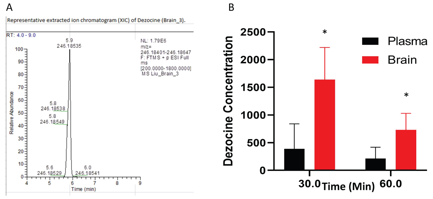 Figure 3: Dezocine in brain and plasma (A) Representative extract ion chromatogram of dezocine in the brain; (B) The content of dezocine (pMol/gm) in brain and plasma (pMol/gm) following intranasal administration. In each time point, the statistical analysis was performed using an unpaired test. p = 0.027 for the point at 30 min; p = 0.028 for the point at 60 min, *indicates statistically significant as compared to the concentration in the plasma. Data are presented as mean ± standard deviation (n = 4 per time point).