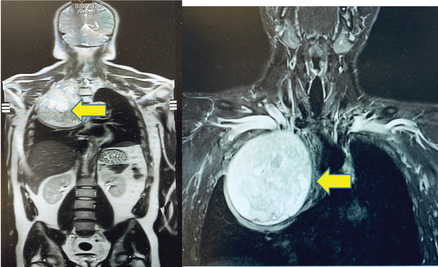 Figure 1: Preoperative Chest MRI image: Heterogeneously enhancing mass (arrows) in the right thoracic inlets and lung apex (13.4 cm × 12.3 cm).