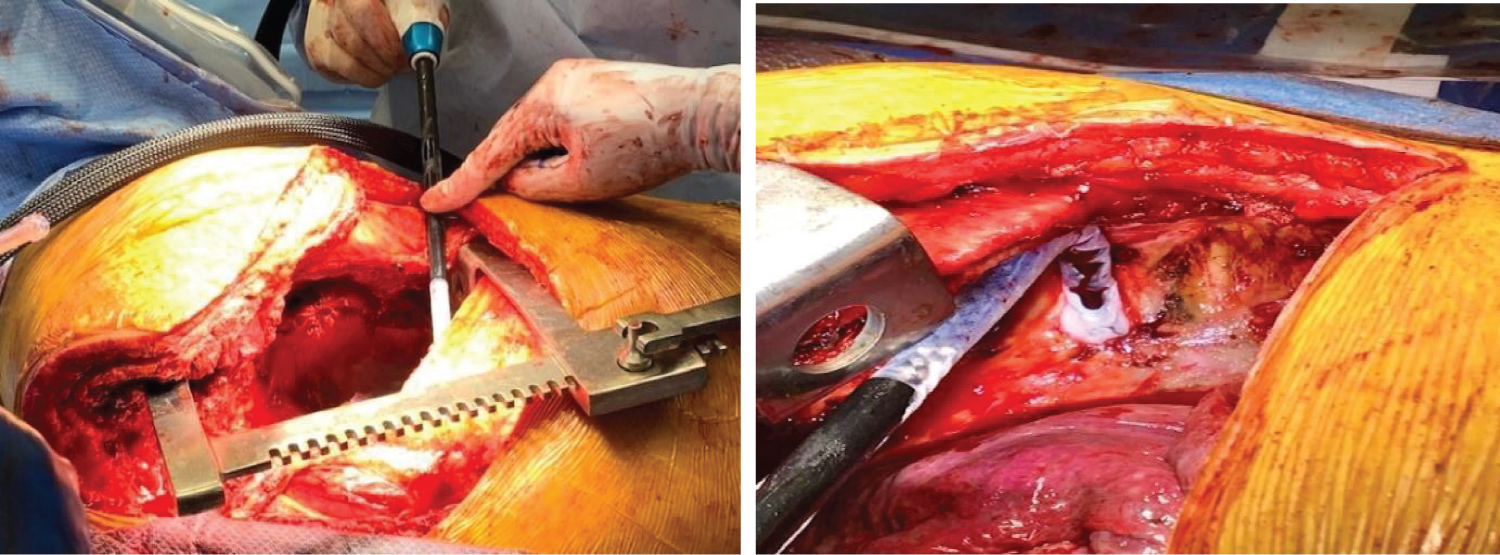 To start the case, the neurosurgeon placed the patient in the prone position to facilitate the dorsal approach to the right of T1-T4 spinous processes and corresponding vertebral bodies. At the level of T2 and T3, the transverse processes were transected, ribs disarticulated and the nerve roots ligated. The patient was then repositioned into the left decubitus position for the chest wall tumor resection including en bloc resection of a portion of T2 and T3 transverse processes (no reconstruction) (Figure 2).