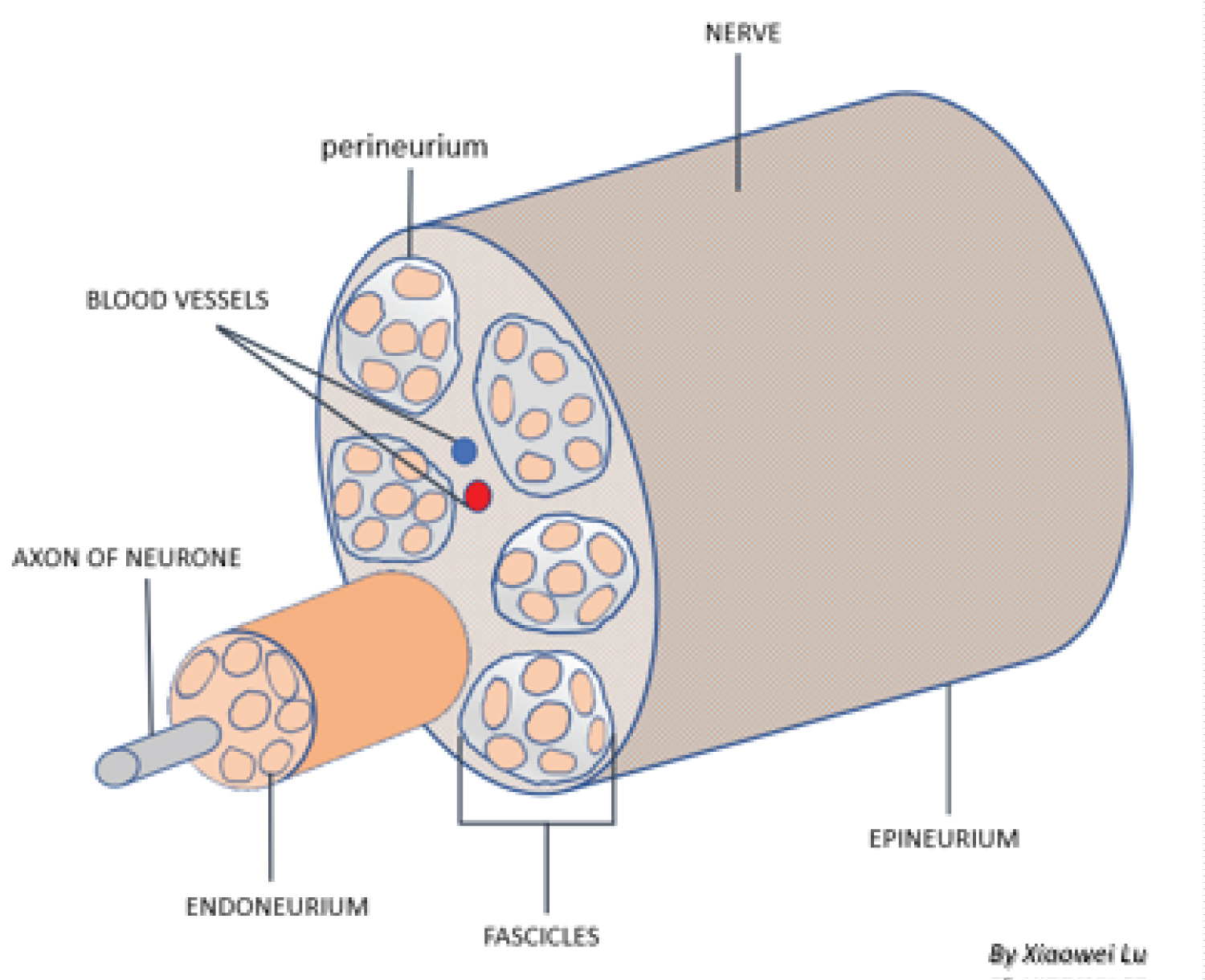 The intercostal nerves (Figure 4) originate from T1-11 ventral rami and innervate the intercostal muscles and provide sensory input from the skin, muscle and parietal pleura. Each nerve axon is surrounded by endoneurium, a layer of connective tissue, and are bundled together into fascicles. Each fascicle is wrapped in a layer of connective tissue called the perineurium and the entire nerve is wrapped in a layer of connective tissue called the epineurium. The different tissue layers play a role in protecting neurons from chemical or mechanical injury (perineurium), and facilitate the blood and lymph flow (epineurium and endoneurium) [12,13].