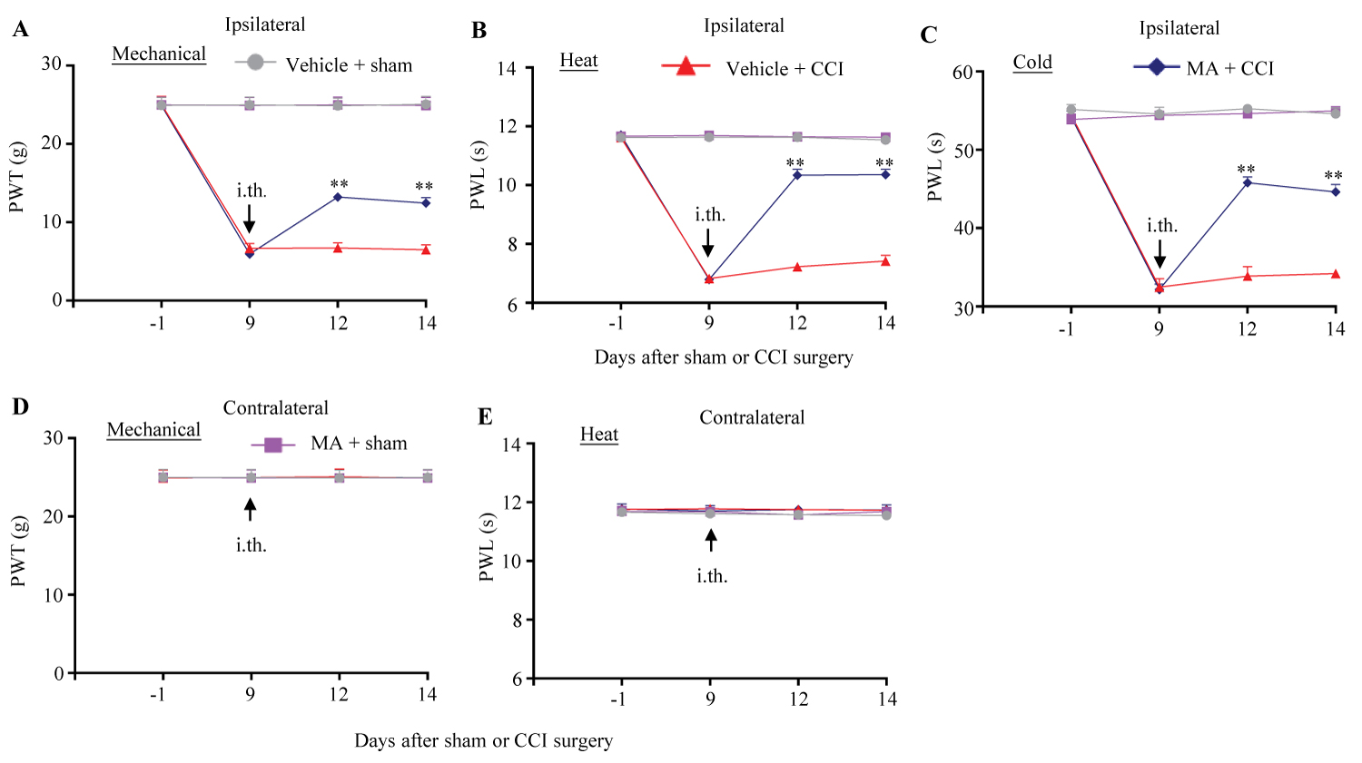 Figure 2: Effect of intrathecal post-administration of meclofenamic acid (MA) on the maintenance of CCI-induced nociceptive hypersensitivity in female rats. 20 μg MA or vehicle (0.01 M PBS) was intrathecally (i.th.) administrated once daily for 5 days starting on day 9 post-surgery. Paw withdrawal threshold (PTW) to mechanical stimulation (A and D) and paw withdrawal latency (PWL) to heat (B and E) and cold (C) stimuli on the ipsilateral (A-C) and contralateral (D and E) sides were performed one day before surgery, prior to MA or vehicle administration on day 9 post-surgery and on days 12 and 14 post-surgery. n = 6 female rats/group. Three-way ANOVA with repeated measures followed by post hoc Tukey test.