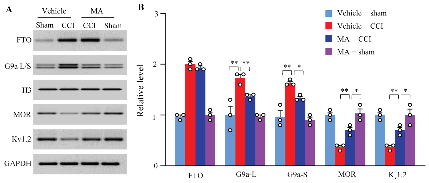 Figure 4: Effect of intrathecal post-administration of meclofenamic acid (MA) on the CCI-induced upregulation of G9a and downregulation of mu-opioid receptor (MOR) and Kv1.2 in the injured DRGs. L: Long isoform. S: Short isoform. Levels of FTO, two isoforms of G9a, MOR, and Kv1.2 proteins in the ipsilateral lumbar 4/5 DRGs on day 14 post-CCI or sham surgery. H3 was set as a loading control for nuclear fraction and GAPDH for cytosolic/membrane fraction. Representative Western blots (A) and a summary of densitometric analysis (B). n = 3 biological repeats (6 rats)/group.