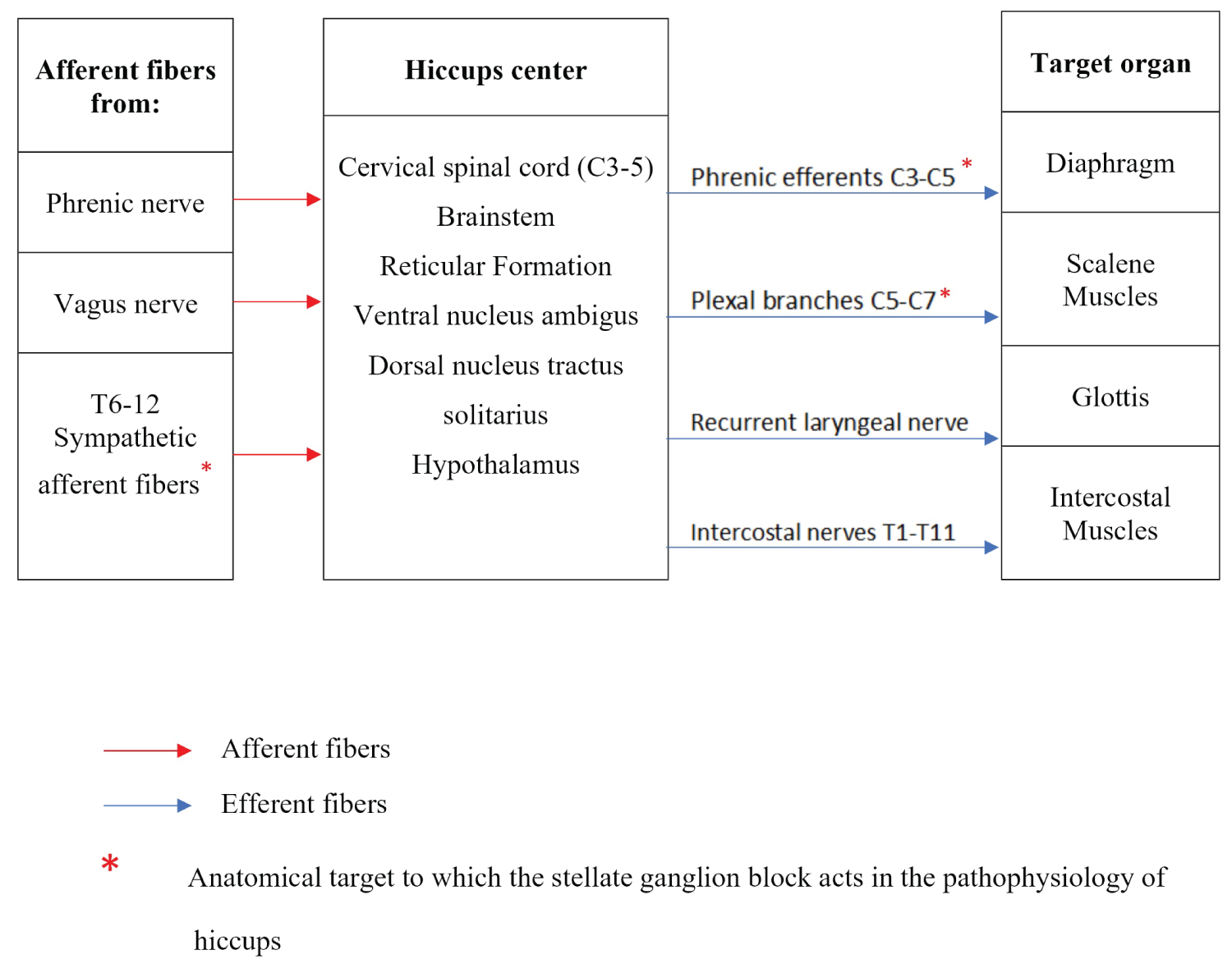 Figure 1 illustrates the anatomy and overall pathophysiology of hiccups. In the hiccups reflex arc, there are three components: The afferent limb, the Central processing unit, and the Efferent limb. An afferent limb consists of a phrenic nerve, vagus nerve, and sympathetic chain originating from T6 to T12 thoracic segments. Initially, the phrenic nerve is considered a unique efferent limb in the hiccups reflex (nerves to diaphragm), but further efferent limbs to the glottis (via the recurrent laryngeal nerve), intercostal muscles (via the T1 to T11 intercostal nerves) and scalene muscles (via the plexal branches C5-C7), are also suspected to be involved [6]. There is an unspecified anatomic site between cervical C3 to C5 segments and the brain stem that is responsible for the central link between afferent and efferent pathways of the hiccups reflex. A number of neurotransmitters are involved in the processing of information, including gamma-aminobutyric acid (GABA) and dopamine [6]. These neurotransmitters can regulate the central mechanism.