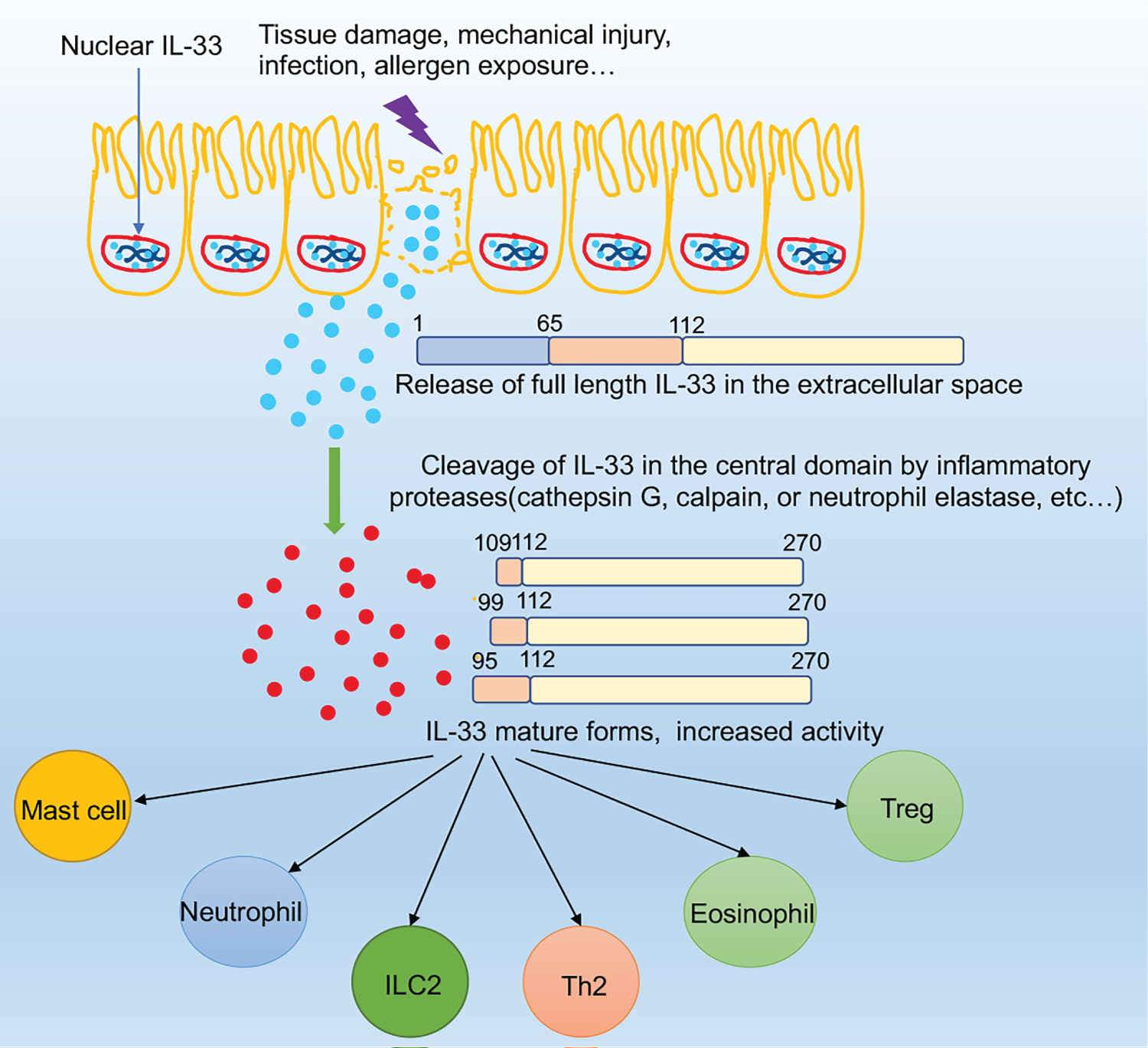 Figure 2: The mechanisms of IL-33 extracellular release. After epithelial cell exposure to tissue damage, mechanical injury, infection, allergen exposure, etc. IL-33 will be quickly released from the nucleus and active the ST2+ cells such as ILC2s. In this process, IL-33 can be cleaved into shorter mature forms by inflammatory proteases such as neutrophils cathepsin G.