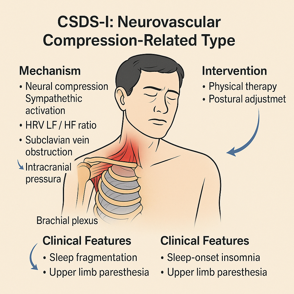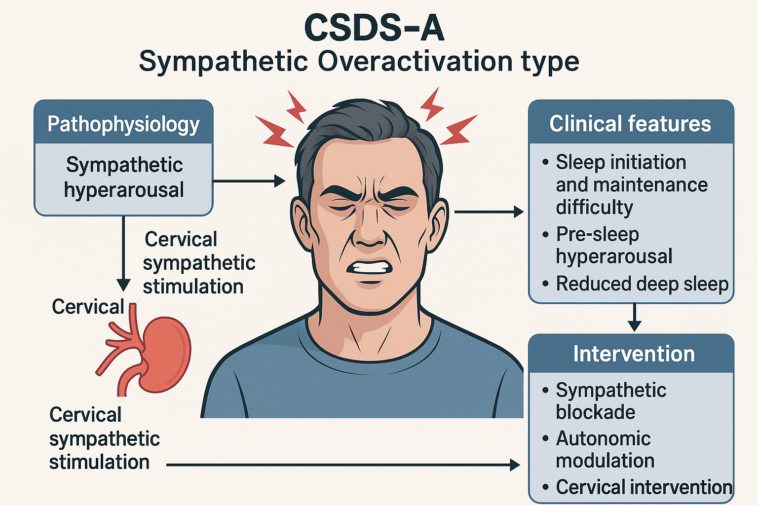 CSDS-A: Cervicogenic Sleep Disorder Syndrome - Type A; Sympathetic Overactivation: A subtype characterized by cervical-driven sympathetic hyperarousal; Cervical Sympathetic Stimulation: Functional or structural excitation of the cervical sympathetic trunk or ganglia; Sympathetic Blockade: Pharmacologic or interventional suppression of sympathetic output (e.g., stellate ganglion block); Autonomic Modulation: Interventions aimed at rebalancing the autonomic nervous system (e.g., HRV biofeedback, vagus nerve stimulation); Cervical Intervention: Manual or procedural therapies targeting the cervical spine or musculature