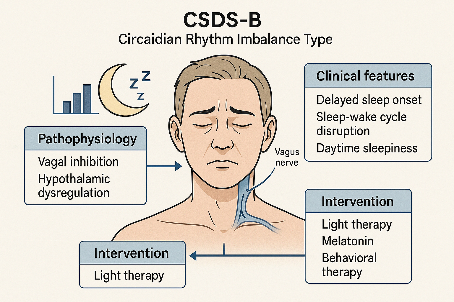 This diagram illustrates the pathophysiological mechanisms, clinical features, and interventional strategies of CSDS-A. Excessive cervical sympathetic stimulation leads to sympathetic hyperarousal, disrupting sleep initiation and maintenance. Key interventions target autonomic dysregulation.