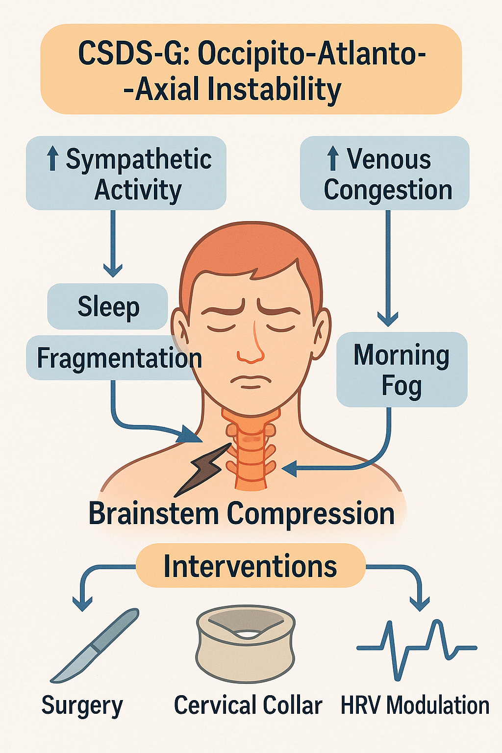 This six-tiered pathophysiological model-spanning cervical dysfunction, brainstem-autonomic imbalance, neuroendocrine–immune amplification, and circadian breakdown-offers a comprehensive framework for stratified diagnosis and targeted interventions. Cervical pathology is not merely a local disorder but can profoundly affect sleep through multisystem interactions. Thus, conventional sleep phase or architecture-based classifications may be insufficient, necessitating integrative diagnostic and treatment strategies.