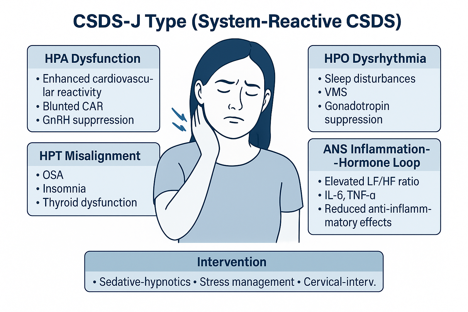Fanielle emphasized the link between somatic symptom disorder (SSD) and sleep disturbance [33], underlining the need for a biopsychosocial approach. Chronic cervical pain, inflammation, and sleep disruption may dysregulate the hypothalamic-pituitary-target gland axes (hypothalamic-pituitary-adrenal (HPA), hypothalamic-pituitary-thyroid (HPT), and hypothalamic-pituitary-ovarian (HPO) ) and the autonomic nervous system (ANS), accompanied by systemic inflammation, thereby disturbing hormonal, sleep, and immune homeostasis across multiple systems [36-40].