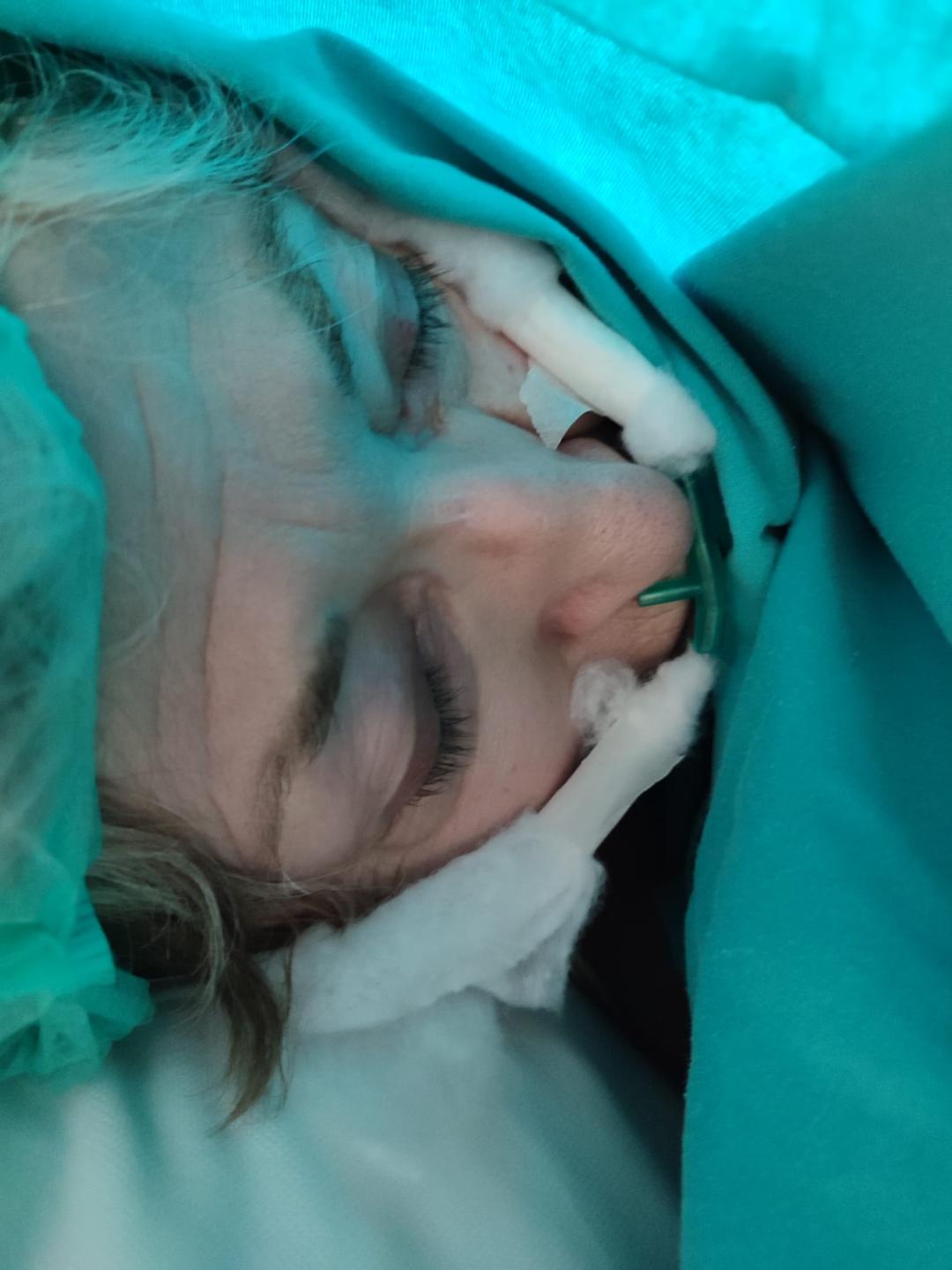 All risks and the planned anesthesia method for the patient were detailed to them. Due to shortness of breath on exertion, we did not apply premedication to our patients. After a short identity check and confirmation of the operation room, special monitoring was applied to the patient with PV. The 3-lead electrocardiogramelectrode was cleaned of adhesive coating and fixed to the wrists and left ankle with non-elastic bandages. The 20 G intravenous (IV) line was also fixed with bandages.The arm was padded with cotton dressing before applying a noninvasive blood pressure (NIBP) cuff (Figure 2). A nonadhesive pulse oximeter probe was also used. After standard monitorization, heart rate was 52/min, blood pressure was 160/85 mmHg,and peripheral oxygen saturation (SpO2) was 90%. Nasal cannula tubes were wrapped with cotton in areas directly touching the skin (Figure 3). At this stage, IV administered a prophylactic dose of cefazolin (2000 mg) and a 'stress dose' of dexamethasone (8 mg).