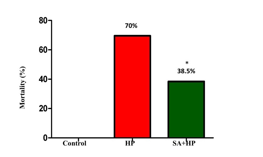 Figure 1: The mortality of different groups. The mortality of HP and SA group was 70% and 38.5%, respectively. There was no death in the control group. The difference between SA and HP groups indicated that SA statistically decreased the mortality significantly (*p=0.014, SA+HP vs. HP. SA: Salvinorin A; HP: Hypoxia).