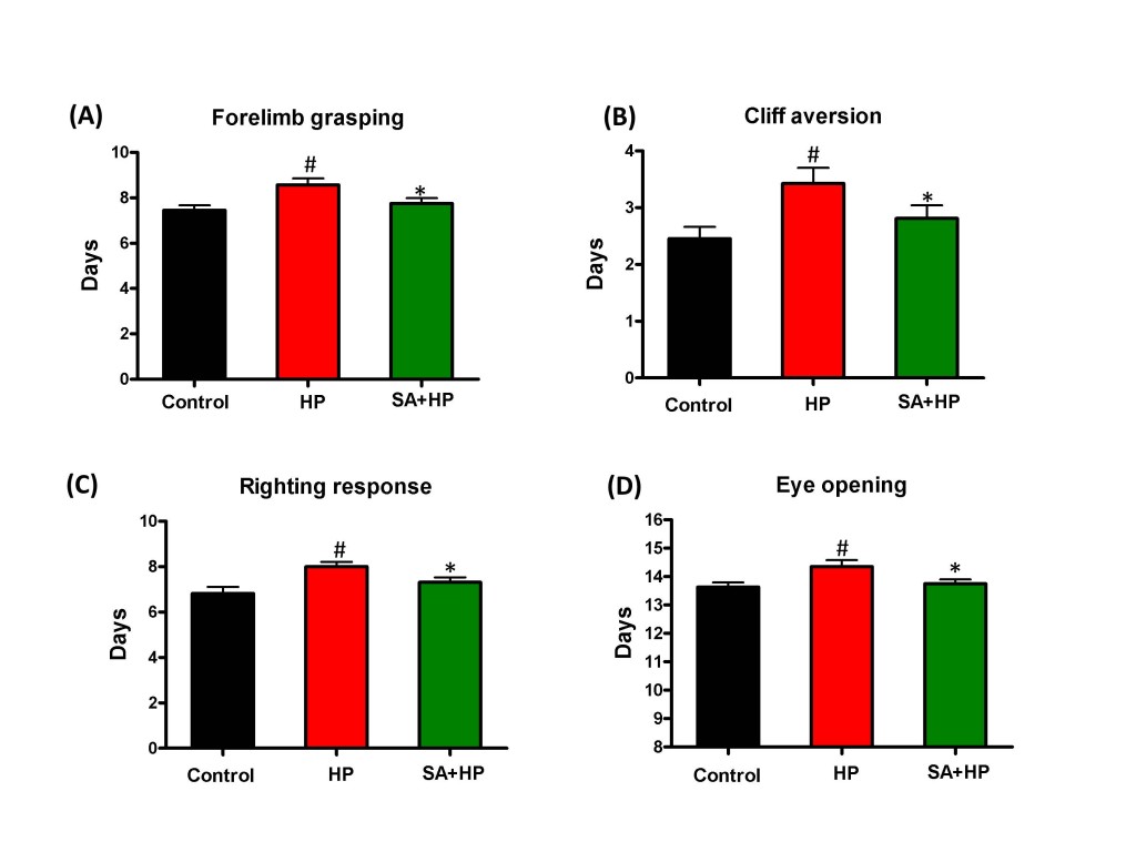 Figure 3: SA improved some of the developmental neurological outcomes. Hypoxia induced significant delay in forelimb grasping (A), cliff aversion (B), righting response (C), and eye opening (D). SA rescued such hypoxia induced neurological outcomes significantly ( # p < 0.05 HP vs. Control ; *p < 0.05 SA+HP vs. HP. SA: Salvinorin A; HP: Hypoxia).