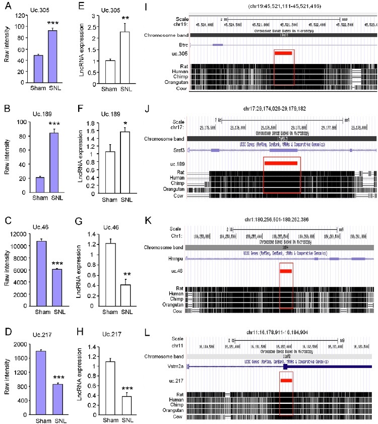 Figure 1: Validation of microarray data by quantitative RT-PCR. (A-H) Microarray data (A-D) and RT-PCR data (E-H) show the expression of uc.305 (A, E), uc.189 (B, F), uc.46 (C, G), and uc.217 (D, H) in the spinal cord of SNL or sham-operated mice. n = 3 mice for microarray data. n = 4-5 mice for RT-PCR. (I-L) The genome location and overlapping genes for uc.305 (I), uc.189 (J), uc.46 (K), and uc.217 (L), respectively. Species conservation alignments of uc.305, uc.189, uc.46, and uc.217 DNA segments among rat, human, chimp, orangutan, and cow were identified by UCSC Genome browser. All the four T-UCRs show 100% conservation across species (mouse, rat, and human). Conserved sequences are highlighted in red rectangle.