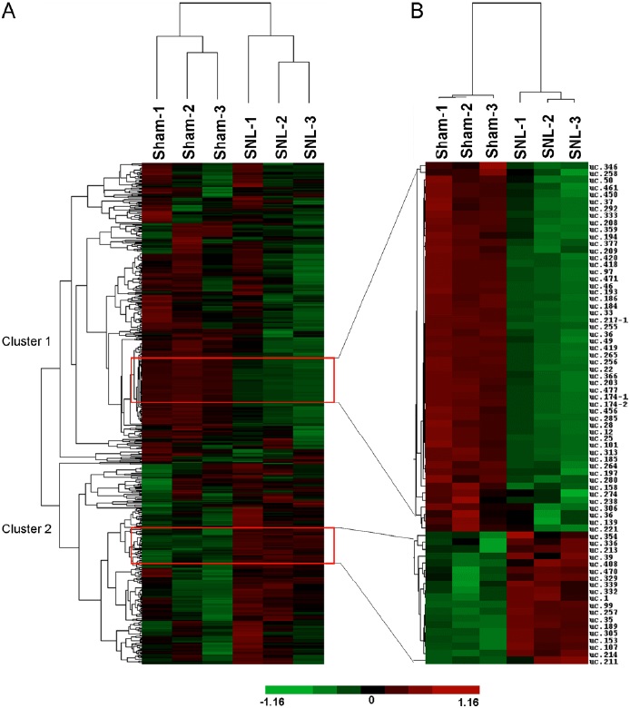 Figure 2: Analysis of T-UCRs expression from SNL and sham mice. (A) Hierarchical clustering shows overall T-UCRs expression pattern of reliably measured probe sets (608). Rows represent individual probe sets. Columns represent individual samples. The scale bar at the bottom of the matrix indicates the degree of T-UCRs expression levels. Green indicates down-regulation. Red indicates up-regulation. Black indicates no change. The expression of T-UCRs was decreased in cluster 1 and increased in cluster 2 after SNL. (B) Heat map shows the T-UCRs whose expression is more than 1.5-fold or less than 0.5-fold after SNL.
