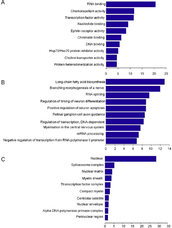 Figure 3: Function prediction of 78 differentially expressed T-UCRs-related mRNAs. Significant molecular functions (A), biological process (B), and cellular component (C), respectively, were listed according to the enrichment scores (-log10 (P-value)) from high to low significance.