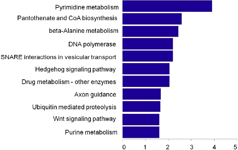 Figure 4: Pathway analysis of 78 differentially expressed T-UCRs-related mRNAs. Enrichment scores (-log10 (P-value)) of the signaling pathways were shown in histogram and listed from high to low significance.