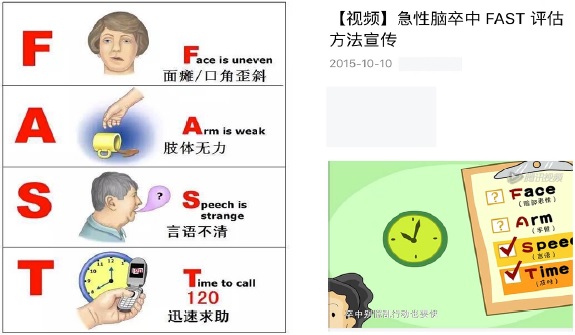 Figure 1: Current FAST education China. Left Panel: An educational material using "FAST" with some simple Chinese explanation; right panel: An educational video using FAST with simple Chinese explanation. The title of the material is "Education using FAST evaluation for acute stroke". The mnemonic English term "FAST" was left as it is. It is indicated that the material is published on Oct 10, 2016. All the above materials are available free online.
