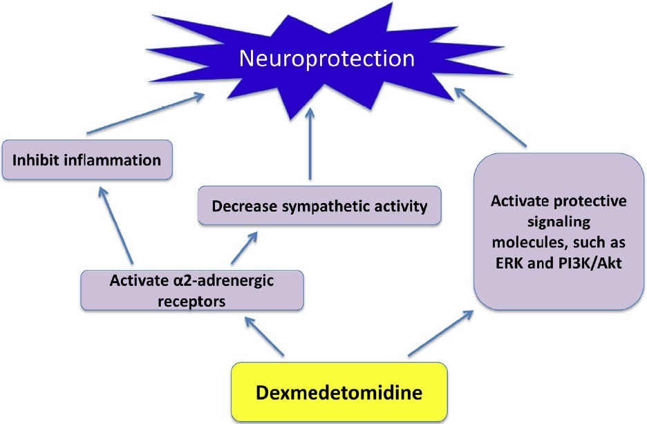 Dexmedetomidine also shows some neuroprotective effects in human. Medications inducing sedation and analgesia are often administrated to patients ventilated mechanically to reduce anxiety and pain and to permit invasive procedures in the intensive care unit (ICU). The MENDS (maximizing efficacy of targeted sedation and reducing neurological dys function) randomized controlled trial was designed to determine whether dexmedetomidine reduces the duration of delirium and coma in mechanically ventilated ICU patients while providing adequate sedation as compared with lorazepam [5]. Total 106 adult medical and surgical ICU patients ventilated mechanically in 2 tertiary care centers were randomly assigned to two groups. They were sedated by dexmedetomidine or lorazepam for as long as 120 hours. Patients were assessed for delirium with using the Confusion Assessment Method for ICU patients twice daily. Patients sedated with dexmedetomidine had more coma-free or coma and delirium-free days and a lower prevalence of coma than sedation with lorazepam. More patients sedated with dexmedetomidine completed post-ICU neuropsychological testing and had similar scores in those tests assessing global cognitive, motor speed, and attention functions. In those ICU patients that were managed with individualized targeted sedation, dexmedetomidine infusion led to more coma or coma and delirium-free days than with a lorazepam infusion at the targeted level of sedation.