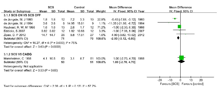 Figure 3, five studies compared 'SCS ON' with 'SCS OFF', which had a significant reduction in nitrate drug usage following SCS (WMD: -2.03, 95% CI: [3.12, -0.93], p=0.0003). However, the χ2 and I2 were 16.27 and 75%, respectively, which suggested heterogeneity among the studies. One study compared SCS with CABG, and this difference was not statistically significant.