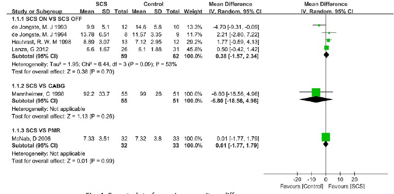 Four studies presented data on the magnitude of STdepression; three of these studies compared 'SCS ON' with 'SCS OFF' [11, 12, 14] and there were no significant differences in the two groups (WMD: -0.01, 95% CI:[0.06, 0.05], p=0.8, test of heterogeneity: χ2 =0.36, I2 =0%, p=0.8). When comparing SCS to CABG, there was a significant increase in ST-depression [10](WMD: 0.13, 95% CI: [0.08, 0.18], p< 0.00001) (Figure 5B).