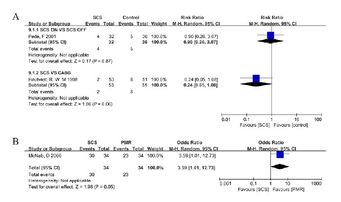 Three studies showed data on SCS relevant adverse events, including cerebrovascular events [10, 12] as well as total events excluding SCS/PMR related events[9]. There was no difference in cerebrovascular events when comparing 'SCS ON' to 'SCS OFF' and there seemed to be a trend towards lower cerebrovascular events in SCS when compared to CABG (OR: 0.21, 95% CI: [0.04, 1.05], p=0.06) (Figure 7A), but this trend did not yield statistical significance. There was a higher level of total events with SCS compared to PMR (OR: 3.59, 95%CI: [1.01, 12.73], p=0.05) (Figure 7B).