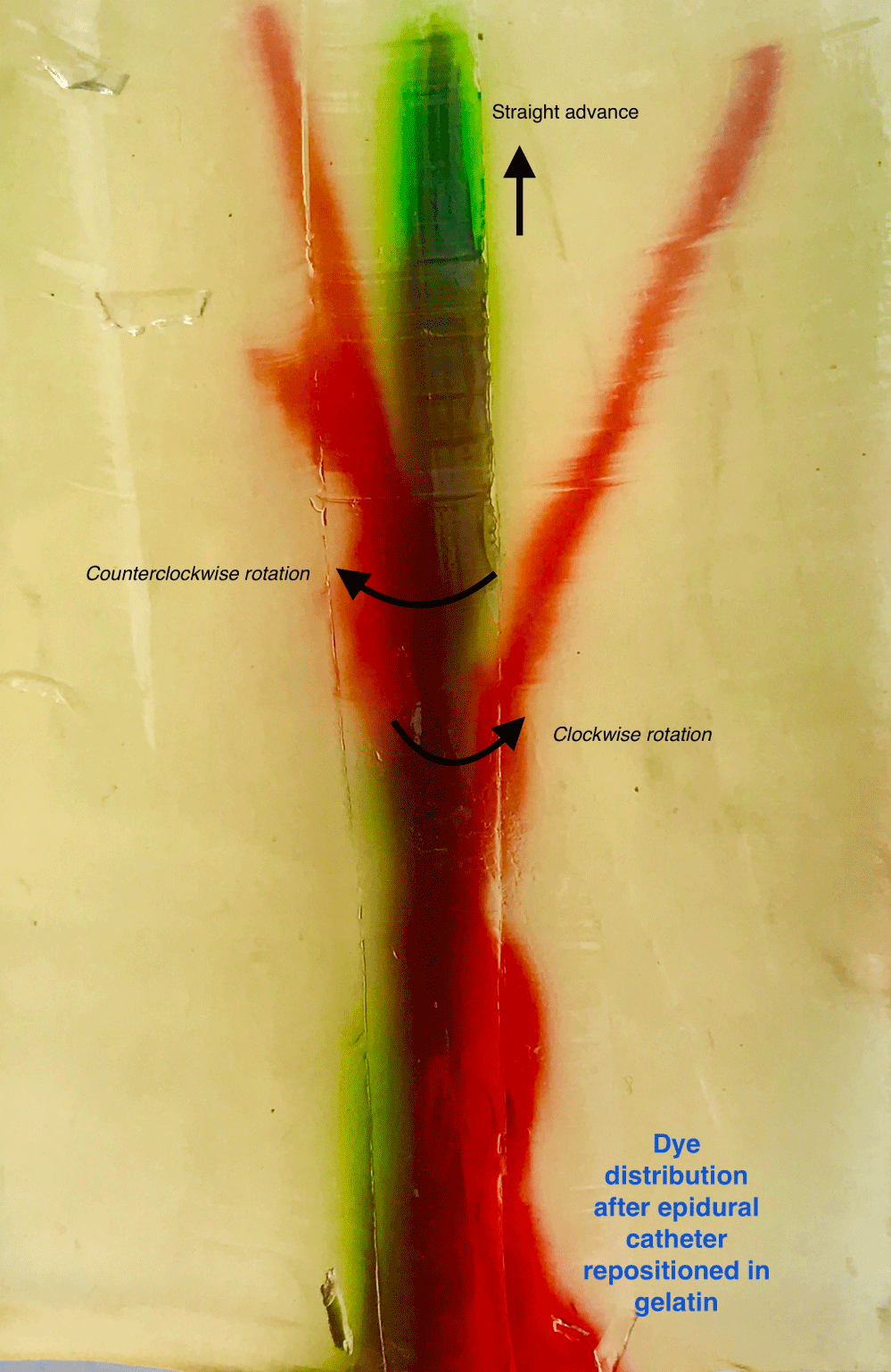 Observations were made on the dye distribution at each position. 2 cc of blue dye was injected via the epidural catheter at the position without a needle manipulation. Each of 2 cc of blue dye was injected into the catheter at the position with either needle clockwise rotation or counterclockwise rotation. Photos and videos were taken from the gelatin demos to show the effects of Tuohy needle rotation on deviating epidural catheter into the middle epidural space. The dye distribution from the catheter into the gelatin was used to demonstrate the effects of repositioned catheter in the epidural space on the dye redistribution.