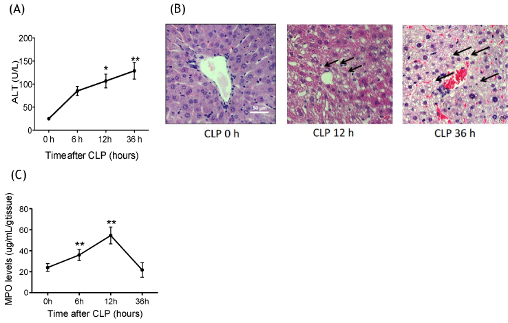Liver injury and neutrophil recruitment following CLP surgery (A) Liver enzymes ALT were measured at 0, 6, 12 and 36 hours after CLP surgery in WT mice (n = 6-8 per group); (B) Liver histology at 0, 12 and 36 hours after CLP surgery in WT mice. Representative images are shown. Vacuolation was shown in arrow; (C) Myeloperoxidase activity levels of liver at 0, 6, 12 and 36 hours after CLP surgery in WT mice (n = 8 per group). Statistical analysis was performed using one-way ANOVA with Bonferroni post hoc analysis.