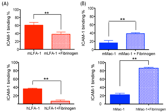 The binding of LFA-1 and Mac-1 to ICAM-1 was tested in vitro with or without fibrinogen (A) Mouse and human LFA-1; (B) Mouse and human Mac-1 were tested. Student t-test was performed. Representative data of three independent experiments (n = 4 per group) are shown. * and ** denotes p < 0.05 and p < 0.01, respectively.