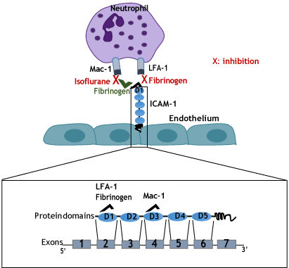Figure 8: Proposed mechanism of neutrophil recruitment to the liver following sepsis (A) Mac-1 binds to ICAM-1 either directly or indirectly through fibrinogen as a bridge. Fibrinogen acts as an LFA-1 antagonist and block its binding to ICAM-1. Isoflurane blocks Mac-1 function; (B) Schematic representation of mRNA and full length protein of ICAM-1. ICAM-1 binding domains to LFA-1, Mac-1 and fibrinogen are indicated on the scheme.