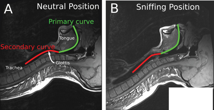 Figure 1: Alignment of the oral, laryngeal and pharyngeal axes with the intubator's visual axis in the "Sniffing Position" as seen on an MRI scan [47]. Part of the figure was adopted from Greenland KB, et al. BJA. 2010;105(5):683-90. published by Elsevier with permission.