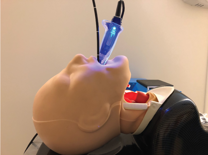 Figure 5: Video-laryngoscope (VL) view of the flexible intubation scope (FIS) having passed the vocal cords. The FIS is retroflexed by pushing the thumb up.