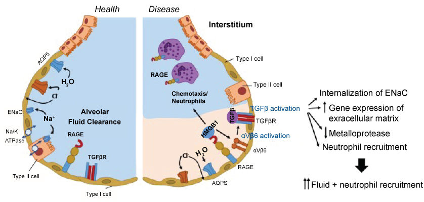 impairment of alveolar fluid clearance. Integrin αvβ6 activates TGF-β. Also HMGB1 is released from dying cells and binds to RAGE on the alveolar epithelial cells. Neutrophils also have RAGE on their surface, and HMGB1 acts as a neutrophil
