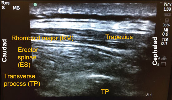 Figure 1: Three muscle layers for the erector spinae plane (ESP) block: Trapezius, rhomboid major (RM), and erector spinae (ES).