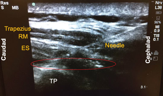 Figure 2: Local injection into the erector spinae (ES) plane. The tip of the needle (red circle) was directed to the myofascial plane between the erector spinae muscle and the T5 transverse process (TP). RM: Rhomboid Major.