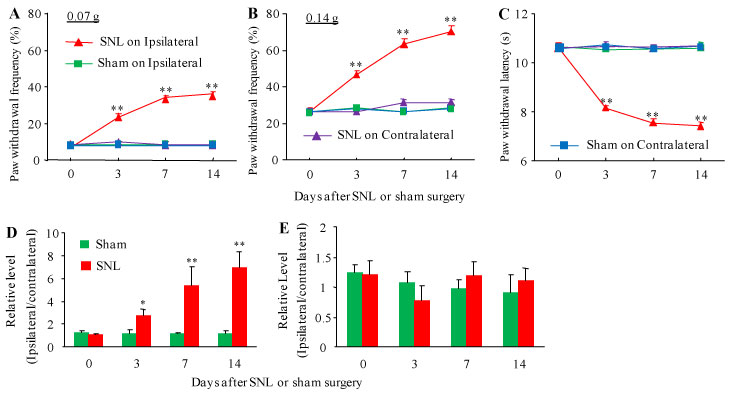 The fourth lumbar (L4) spinal never ligation (SNL)-induced neuropathic pain model in mice was carried out as described previously [17-22]. Briefly, mice were anesthetized with isoflurane and the L4 spinal nerve was exposed through removal of the L4 transverse process. After exposure and isolation of the L4 spinal nerve, a tight ligation with 7-0 silk thread was made and the nerve was transected distal to the ligature. The surgical procedure for the sham group was identical to that of the SNL group, except that the spinal nerves were not transected or ligated.