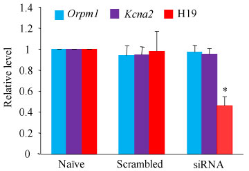 Figure 3: Effect of H19 siRNA on the expression of H19 RNA, Oprm1 mRNA and Kcan2 mRNA in the cultured DRG cells. The expression of H19 RNA, Oprm1 mRNA and Kcan2 mRNA in the cultured DRG cells from adult mice transfected without (naive) or with H19 siRNA (50 ng) or negative control scrambled siRNA (50 ng). n = 3 biological repeats/treatment. *P < 0.05 vs the corresponding naive group. One-way ANOVA with repeated measures followed by Tukey post hoc test.