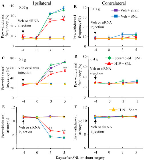 Figure 4: Effect of blocking SNL-induced increase in DRG H19 on SNL-induced development of pain hypersensitivity. SNL or sham surgery was carried out on day 4 after DRG microinjection of H19 siRNA (H19), negative control scrambled siRNA (scrambled) or vehicle (Veh). Paw withdrawal frequency to low (0.07 g; A, B) and median (0.4 g; C, D) force von Frey filament stimuli and paw withdrawal latency to thermal stimulation (E, F) at different days post-SNL or sham surgery on the ipsilateral side (A, C and E) and contralateral side (B, D and F) of mice with microinjection of H19 siRNA or negative control scrambled siRNA into the ipsilateral L4 DRG. n = 5 mice/group. ##P< 0.01 vs the vehicle-microinjected sham mice at the corresponding time point. Two-way ANOVA with repeated measures followed by post hoc Tukey test.