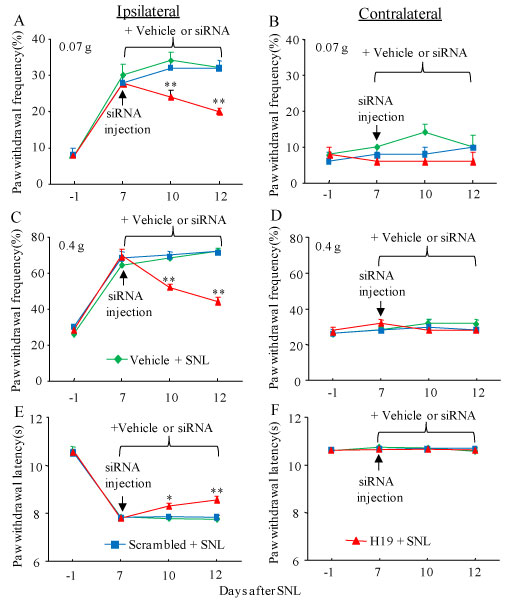 Figure 5: Effect of blocking SNL-induced increase in DRG H19 on the maintenance of SNL-induced pain hypersensitivity. Mice were subjected to SNL 7 days before DRG microinjection of H19 siRNA (H19), negative control scrambled siRNA (Scrambled) or vehicle. Paw withdrawal frequency to low (0.07 g; A and B) and medium (0.4 g; C and D) force von Frey filament stimuli and paw withdrawal latency to thermal stimulation (E and F) on both ipsilateral (A, C and E) and contralateral (B, D and F) sides of mice with microinjection of H19 siRNA, negative control scrambled siRNA or vehicle into the ipsilateral L4 DRG at different days after SNL. n = 5 mice/group. *P < 0.05 or **P < 0.01 vs the vehicle-microinjected SNL mice at the corresponding time point. Two-way ANOVA with repeated measures followed by post hoc Tukey test.