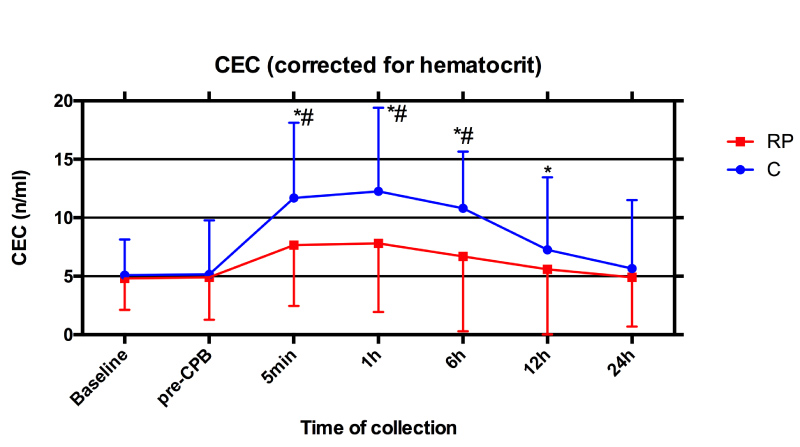 50 patients undergoing mitral valve replacement surgery were randomly assigned either to the RP group (n = 25) or the control group (C, n = 25). Perioperative data were recorded and blood samples were obtained preoperatively (baseline, pre-CPB, 5 minutes, 1, 6, 12 and 24 hours post aortic-cross-clamping). CEC-release and parameters of endothelial function (vWillebrand-Factor (vWF), soluble-thrombomodulin (sTM)), inflammation (Interleukin-6, TNFα), oxidative stress (MDA), myocardial cellular injury (CK-MB, troponin-I) and cerebral injury (S-100β) were measured.