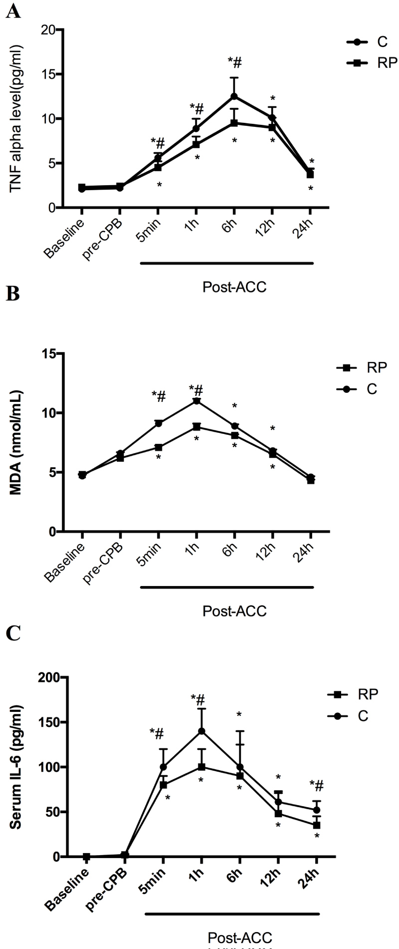 As shown in Figure 3A-Figure 3C, TNFα, MDA and IL-6 concentrations didn't differ between group C and group RP at baseline and pre-CPB. MDA and IL-6 steady increased till 1h post-ACC while TNFα concentration started to decrease at 6h post-ACC (P < 0.05 compared with Baseline and pre-CPB). After reperfusion, all parameters in group RP were significantly lower than that in group C till they reached peak value (P < 0.05).